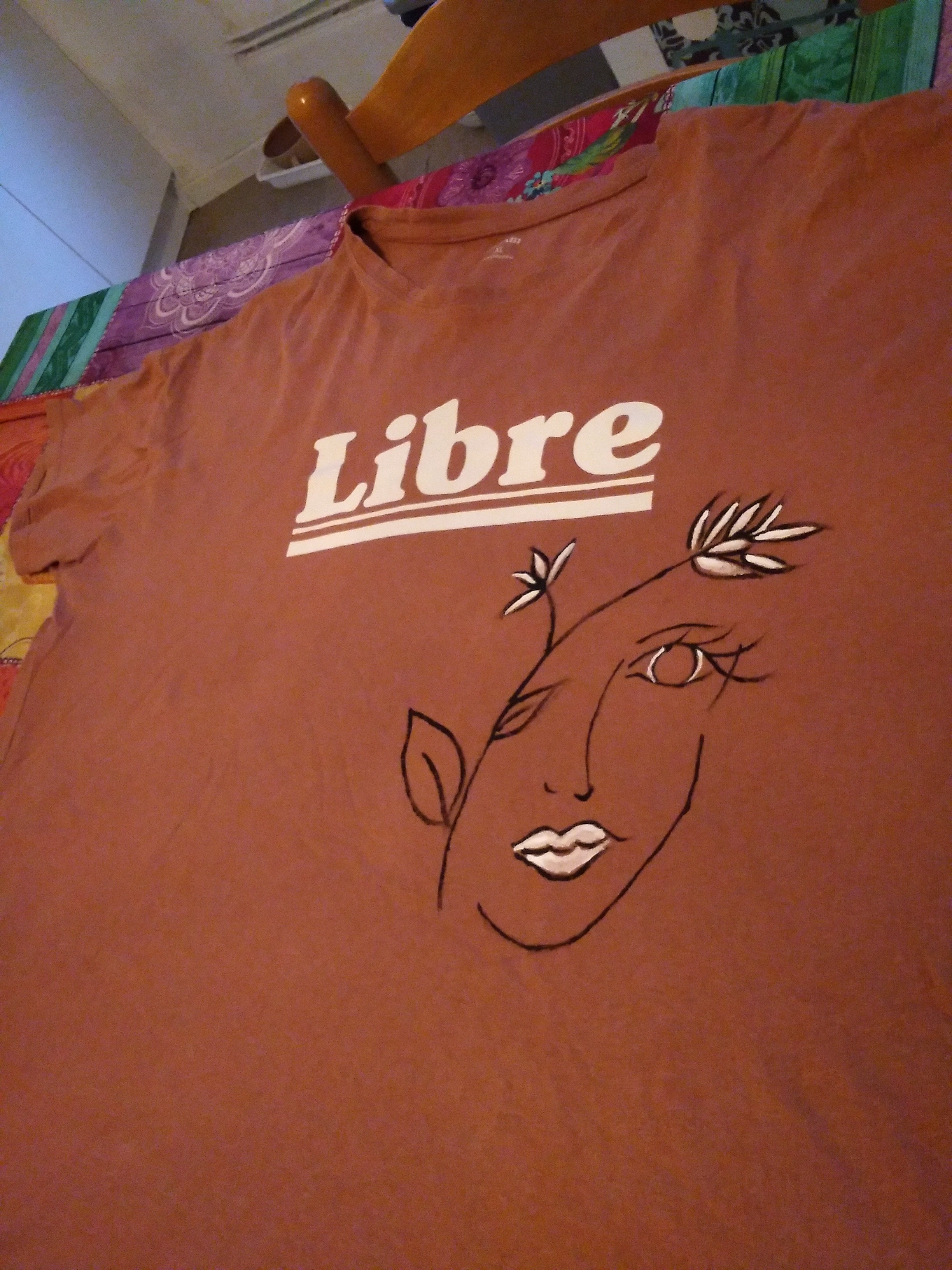 J'adore j'adore , 🤗je suis une personne qui crée et j'ai trouvé à un prix raisonnable ce que je cherchais et en plus me promener dans le magasin m'a donné envie pour plein d'autres choses.... pour ma part je me suis lancé à faire de la peinture sur textile et voilà mon résultat ( le mot LIBRE était déjà moi j'ai fait le visage)