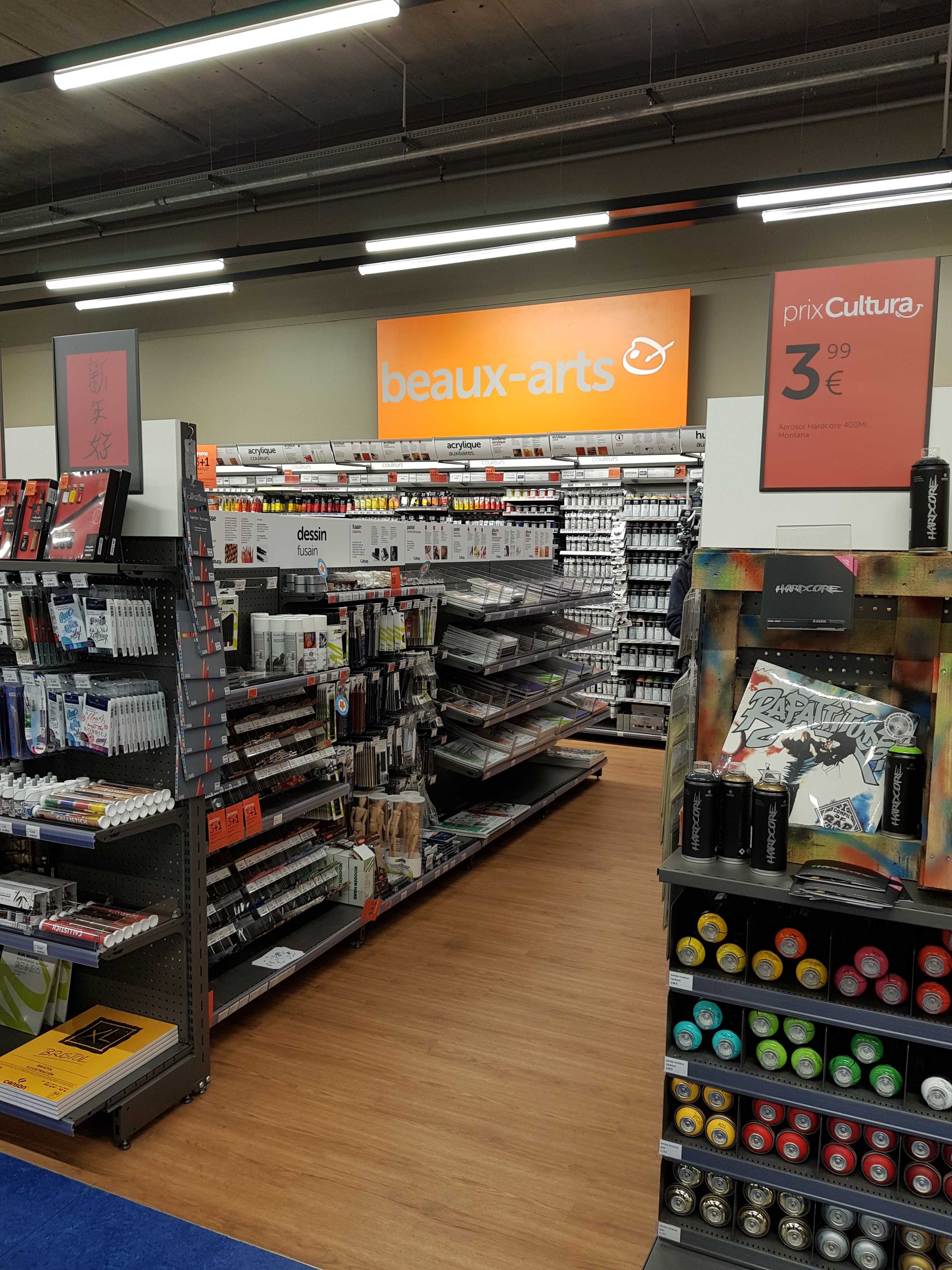 Un cultura avec un large choix d'articles allant des livres en tout genres jusqu'au matériel de pratiques artistiques.