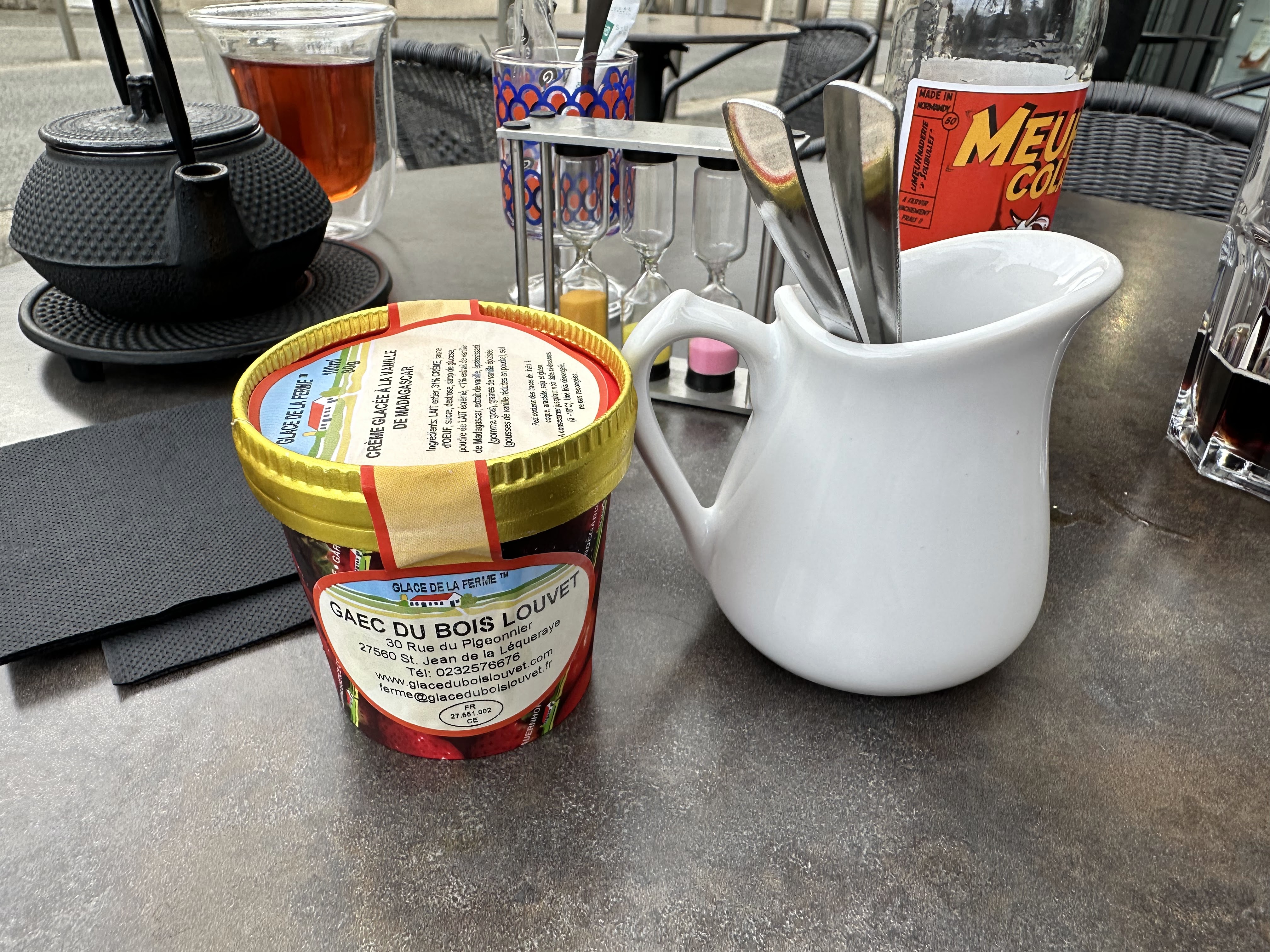 Vu du loin, ce petit café librairie attire l’œil. L’accueille à l’intérieur est très chaleureux et le lieu et très agréable. Faute de pouvoir goûter les pâtisseries maison (nous sommes arrivés trop tard), nous avons commandé un cola normand, un roïbos et un pot d’une délicieuse glace à la vanille de Madagascar fabriquée dans une ferme, qui nous ont été servis en terrasse. J’ai beaucoup apprécié cet instant. J’y retournerai.